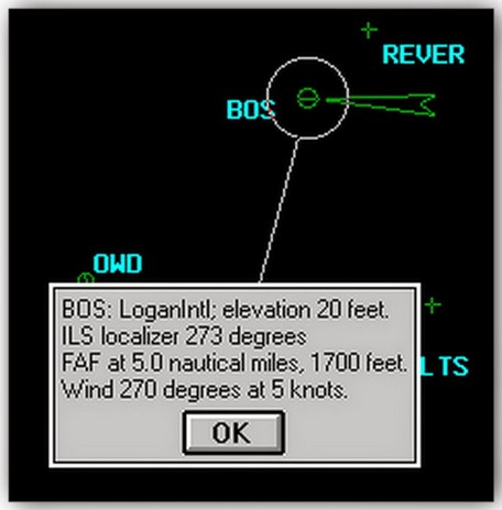 Note: This is the single most important tip on the page. You must understand the concept to land an aircraft. Arrivals require clarification and are the trickiest to handle, mainly because they take so much of your attention. After accepting the handoff from Center, you must vector the arriving aircraft to the Final Approach Fix (FAF) and descend it so that it arrives at the destination airport's FAF altitude AND a heading from which to begin the approach. This usually involves intense concentration and great skill, since you must anticipate when to turn and descend the aircraft and alter the times you give these commands depending on the specific aircraft type. Handling arrivals with finesse requires the most experience of all. "Handoff" is used to clear the aircraft for the approach and handoff the aircraft to the appropriate tower controller. When you clear an aircraft for the approach, it will turn and intercept the approach course for its destination airport. You still have control of the aircraft until it reaches the FAF, whereupon it will switch over to the tower frequency and you will be unable to contact the aircraft unless it misses the approach and the tower hands it back to you for another try. If the aircraft reaches the FAF without being at the required final approach altitude for the airport or is more than 30 degrees off the final approach heading, the aircraft will automatically execute a missed approach and fly outbound on the approach heading at its last assigned altitude. You must then bring the aircraft around again for another try. The FAF is just outside the localizer or final approach course. To find the FAF altitude of each airport, select DETAIL | AIRPORT and select the airport in question. In this example, the FAF altitude for Logan (BOS) is 1,700'.