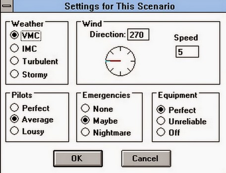 For a realistic sim, I recommend these settings. Remember that flipping the wind may also flip the runways. Setting the WX to "Stormy" causes roving T storms and lots of vectoring. Unreliable equipment will cause loss of radios and/or radar.